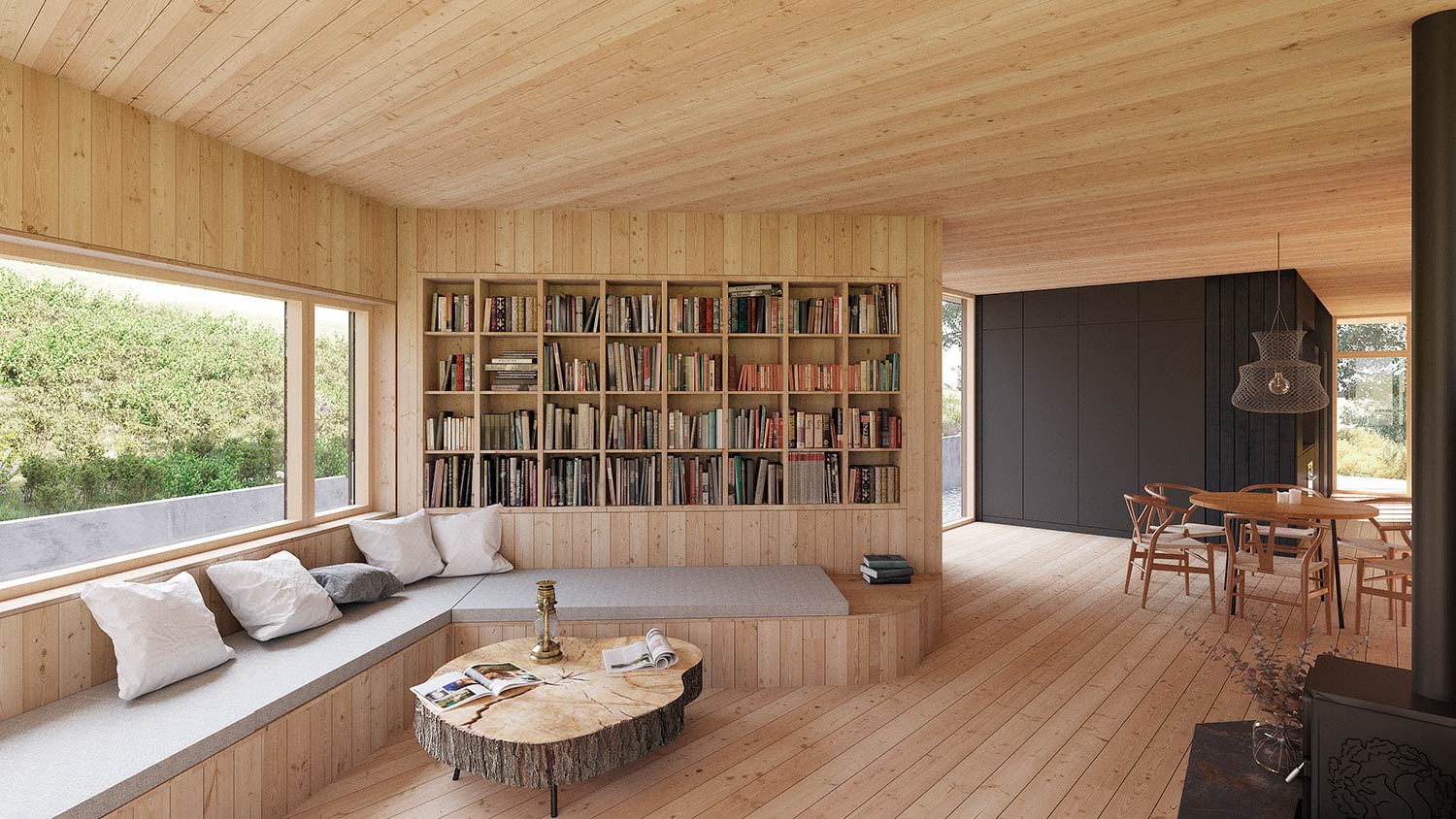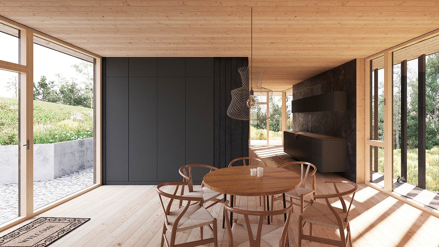 Indersiden af sommerhuset bruger en varm og omfavnende palet af materialer, mens dets sorte ydre flyder som på et skib på en frodig grøn bølge. Materialernes kontrast og taktilitet skaber en øjeblikkelig forbindelse med den menneskelige skala og skaber en varm og indbydende atmosfære for sine brugere.