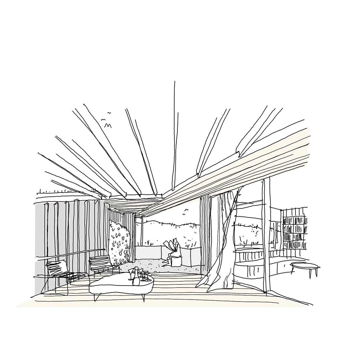Sommerhuset er omhyggeligt designet til at imødekomme vores kunders behov for privatliv og samtidig bevare en ekstraordinær udsigt over landskabet. Unikke udsigter er naturligt indrammet af arkitekturen, mens de lodrette lameller sikrer privatlivets fred, mens de filtrerer dagslys ind i bygningen.